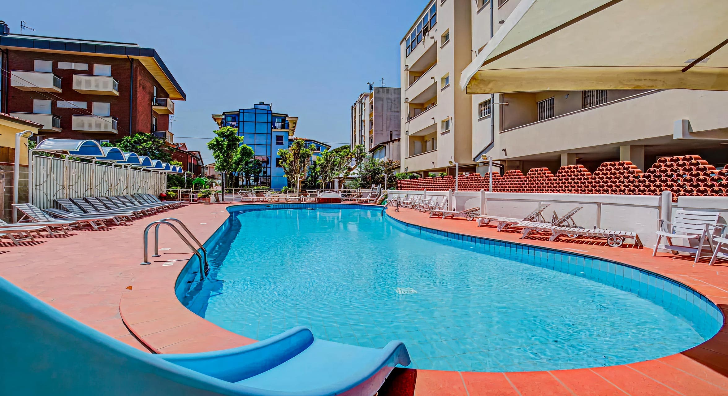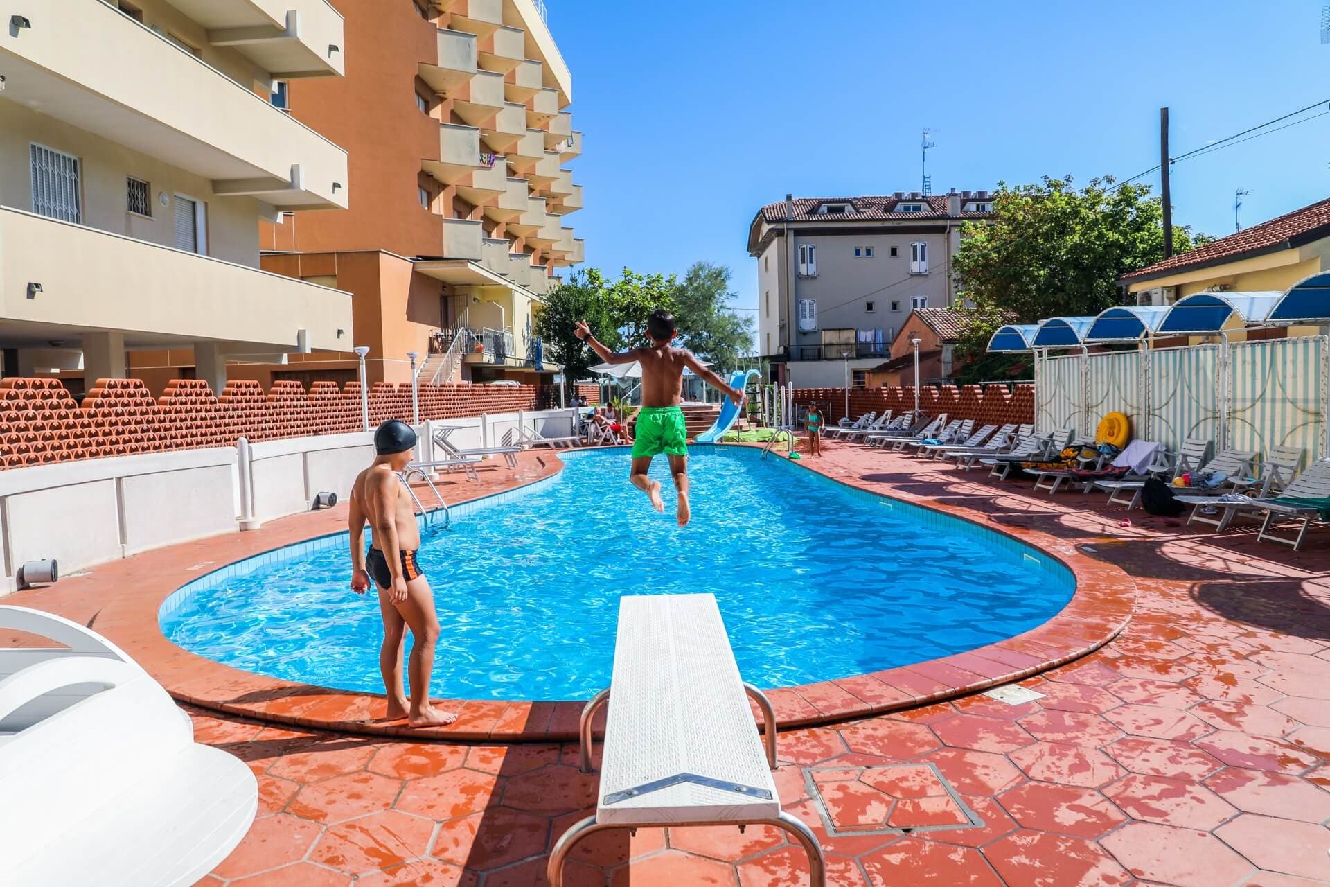 The swimming pool of the Hotel Rosalba Resort has a diving board, water slide and children's play area (with 50 cm deep water)