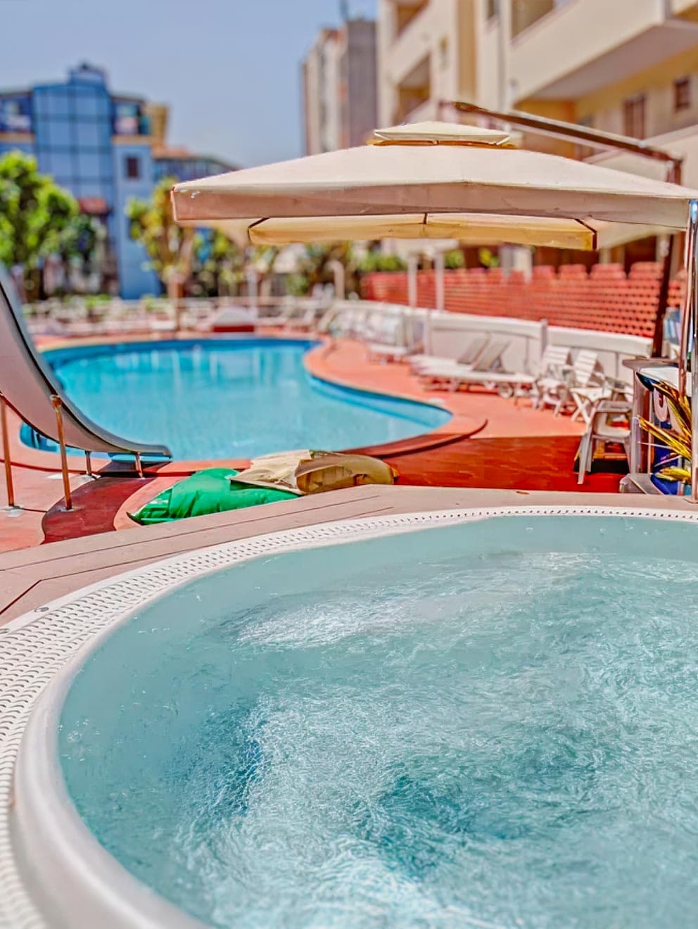 The solarium area that surrounds it is equipped with bathrooms, showers, sunbeds, chairs and tables with a circular JACUZZI surrounded by plants and flowers and which will make their holiday even more pleasant and relaxing.