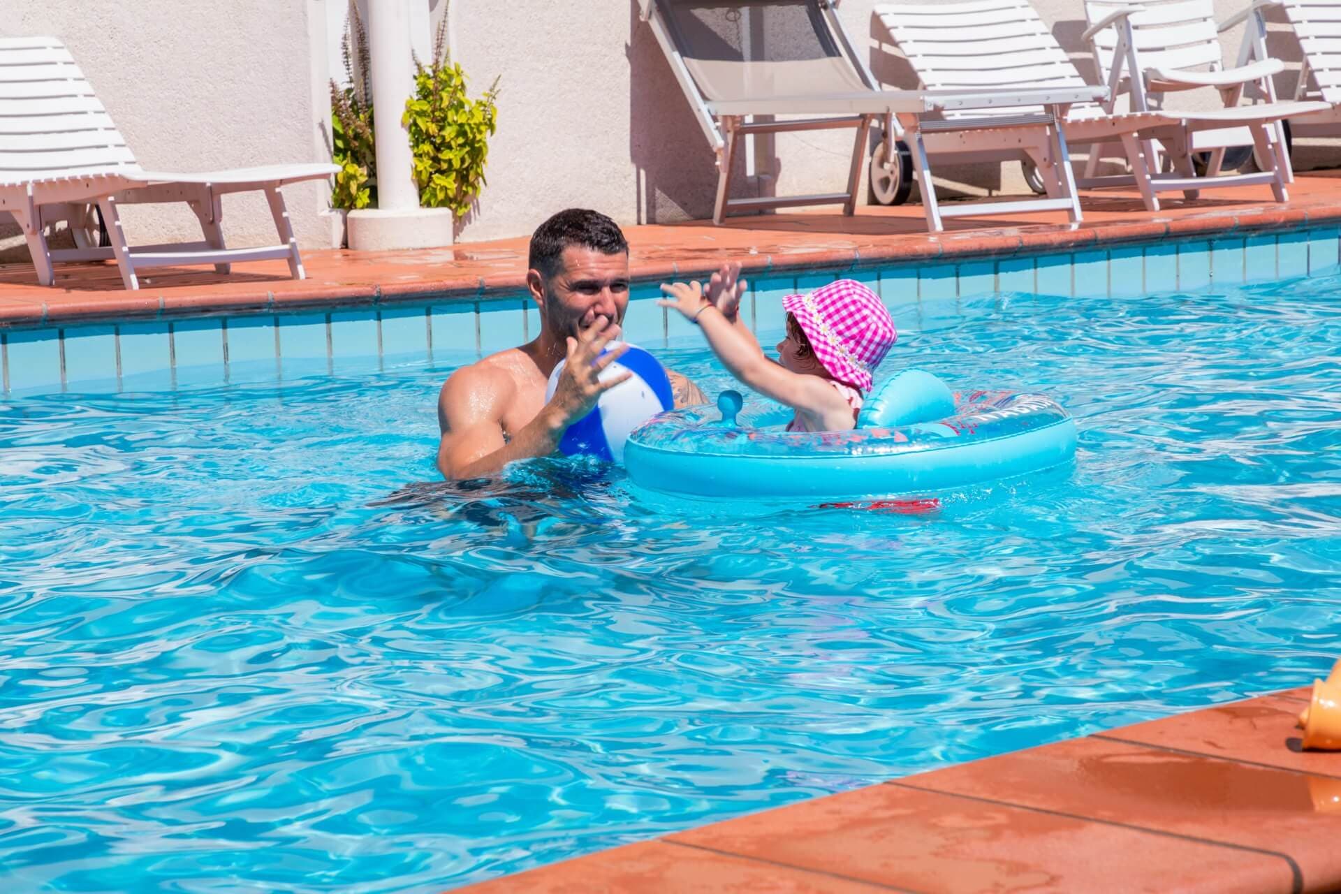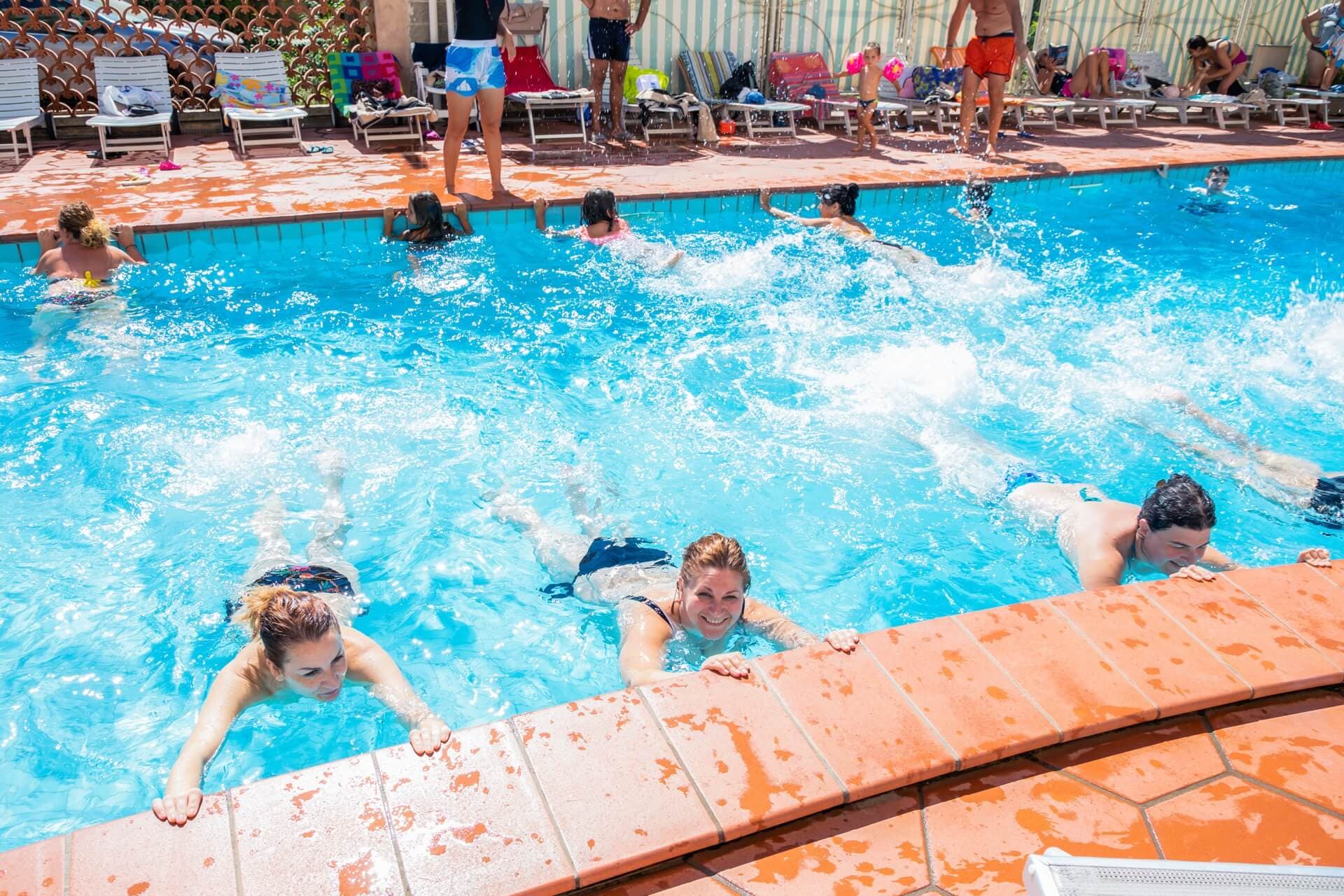 Halfway between the main body of the hotel and the beach, surrounded by lush plane trees, ancient tamarisks, oleander hedges and maritime cinerary bushes, the swimming pool is the centre of the entertainment activities of the hotel staff: early in the morning we are waiting for you for muscle toning or water aerobics, then with group dances in the water and at 12:00 every day with a thirst-quenching non-alcoholic aperitif.